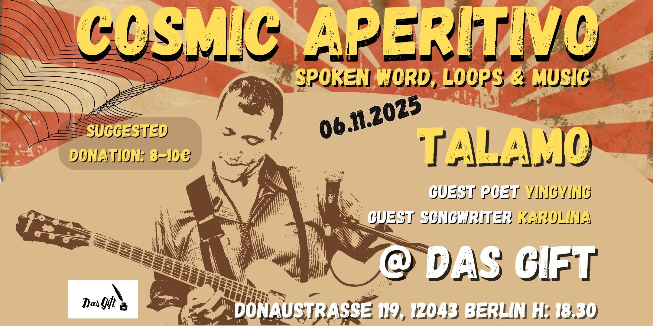 Escape the ordinary and join us for the Pilot Night of a brand new live music experience at Das Gift! This is an intimate, early-evening performance that embodies the raw, experimental spirit of Berlin. TALAMO (Silvio Talamo) is a Berlin-based experimental singer-songwriter and vocal performer whose work creates a fluid form between concert and performance. …